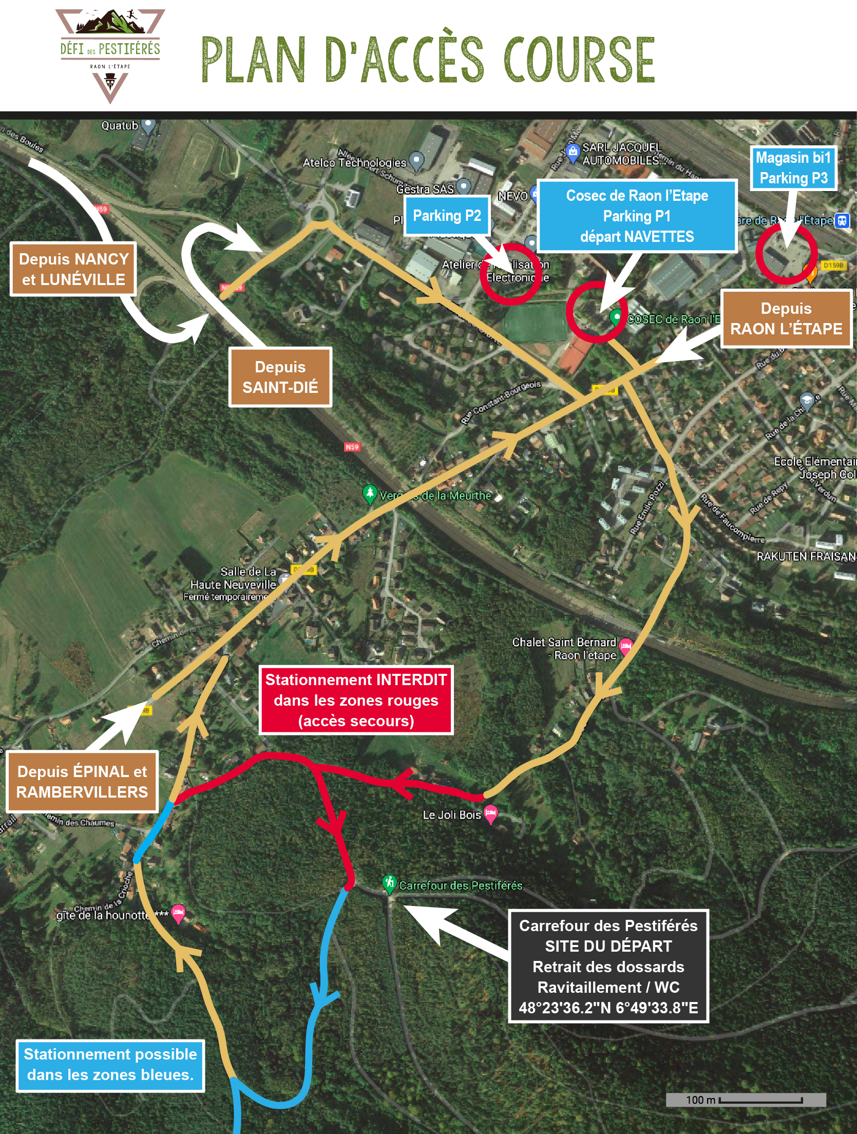 Les participants de la PESTIF’ en solo ou relais et PESTIF’ MIX sont vivement encouragés à utiliser les navettes ou à covoiturer, mais ils peuvent accéder au site de départ en voiture en suivant les panneaux TRAIL aux entrées de la ville de Raon l’Étape jusqu’au chemin de la Hounotte, puis suivre les indications des bénévoles pour se garer le long de la route forestière des Pestiférés, et enfin, rejoindre à pied le site de départ au carrefour des Pestiférés.